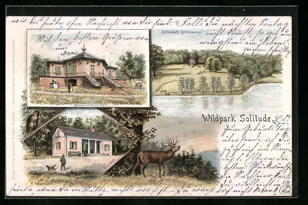 Lithographie Stuttgart, Wildpark Solitude - Bärenschlösschen, Hirschwiese, Röhrender Hirsch