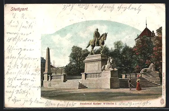 Lithographie Stuttgart, am Denkmal Kaiser Wilhelm I.