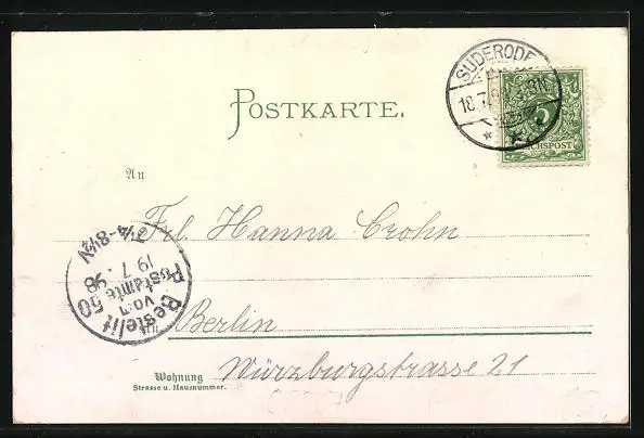 Personenbezogene Daten auf der Rückseite der Karte wurden durch blauen Textmarker unkenntlich gemacht. Die blauen Stellen sind auf die Vorderseite durchgeweicht und wirken sich negativ auf das Postkartenfoto aus