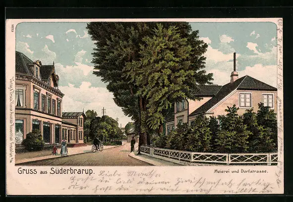 Lithographie Süderbrarup, Meierei und Dorfstrasse mit Radfahrer