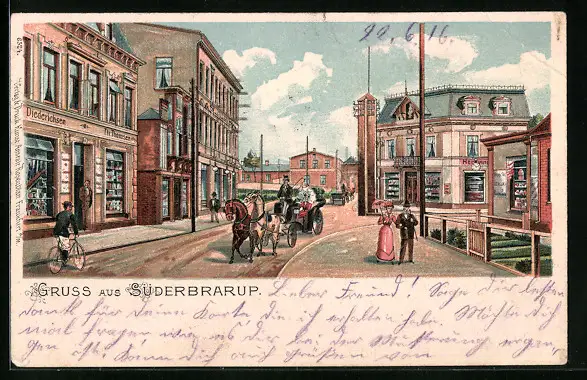 Lithographie Süderbrarup, Strassenpartie mit Geschäft von Th. Thomsen