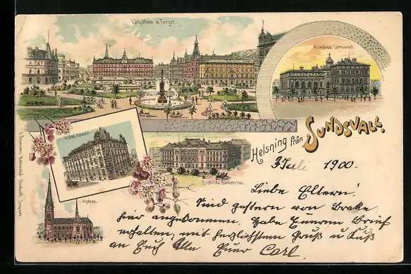 Lithographie Sundsvall, Allmänna Läroverket, Vängafvan & Torget, Kyrkan, Enskilde Bankenshus