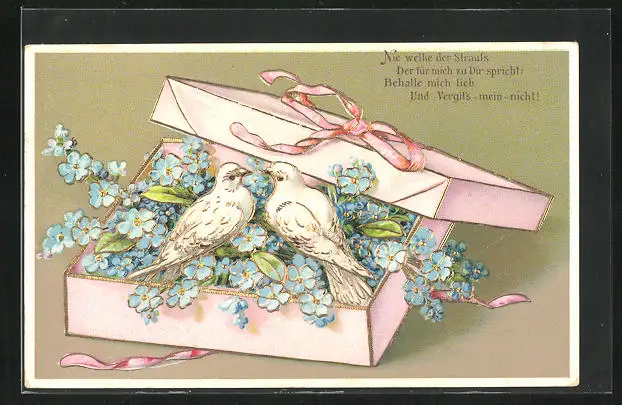Lithographie Tauben mit Vergissmeinnicht in einer Schachtel