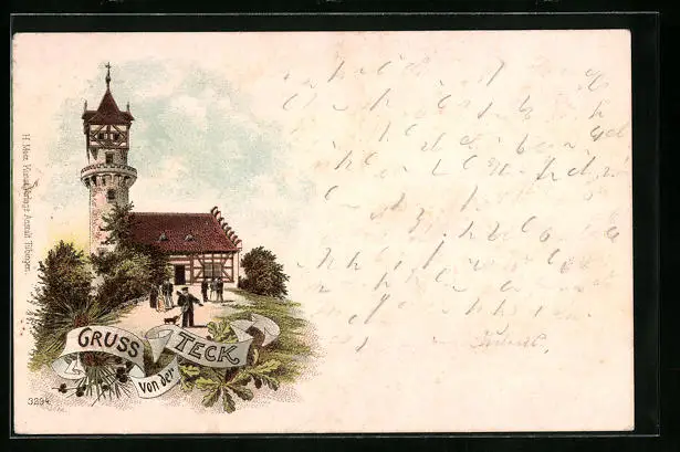 Lithographie Teck, Aussichtsturm mit Besuchern