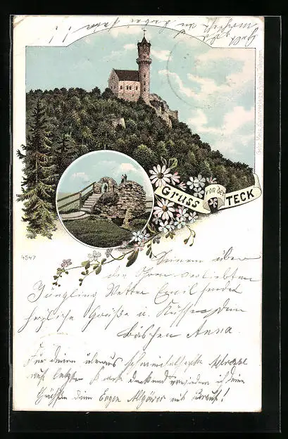 Lithographie Teck, Gebäude mit Turm, Aussichtspunkt mit Treppe