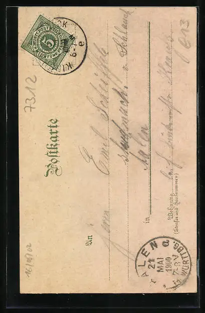 Personenbezogene Daten auf der Rückseite der Karte wurden durch blauen Textmarker unkenntlich gemacht. Die blauen Stellen sind auf die Vorderseite durchgeweicht und wirken sich negativ auf das Postkartenfoto aus