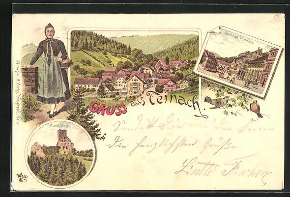 Lithographie Teinach, Badhotel m. Hirsch, Zavelstein, Frau mit Korb