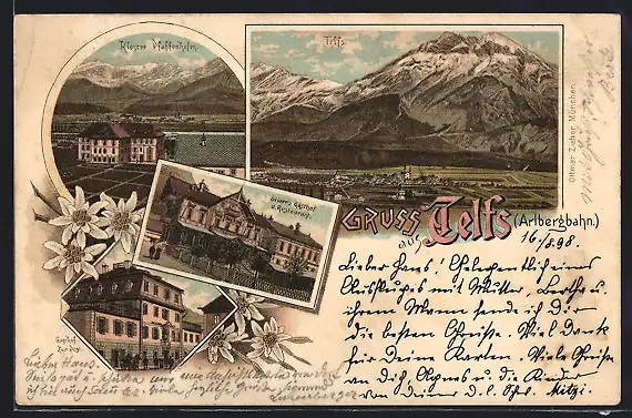 Lithographie Telfs /Arlbergbahn, Seisers Gasthof und Restaurant, Gasthof zur Post