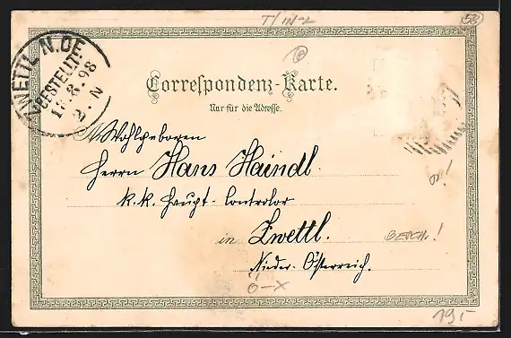 gelaufen 1898, Eckknick li. oben, Briefmarke entfernt, rückseitig Oberflächenschaden, guter Zustand