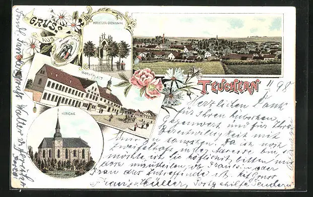 Lithographie Teuchern, Totalansicht, Krieger-Denkmal, Marktplatz, Kirche