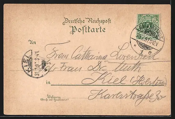 Personenbezogene Daten auf der Rückseite der Karte wurden durch blauen Textmarker unkenntlich gemacht. Die blauen Stellen sind auf die Vorderseite durchgeweicht und wirken sich negativ auf das Postkartenfoto aus