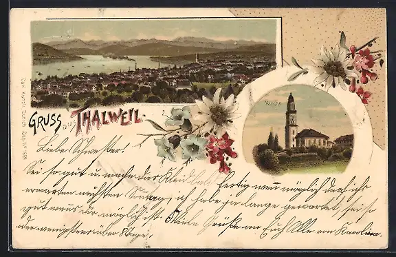 Lithographie Thalweil, Kirche, Ortsansicht mit Blick ins Land