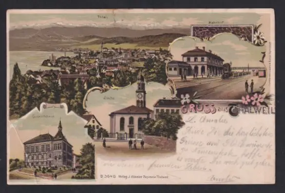Lithographie Thalweil, Totalansicht, Kirche, Gemeindehaus, Bahnhof