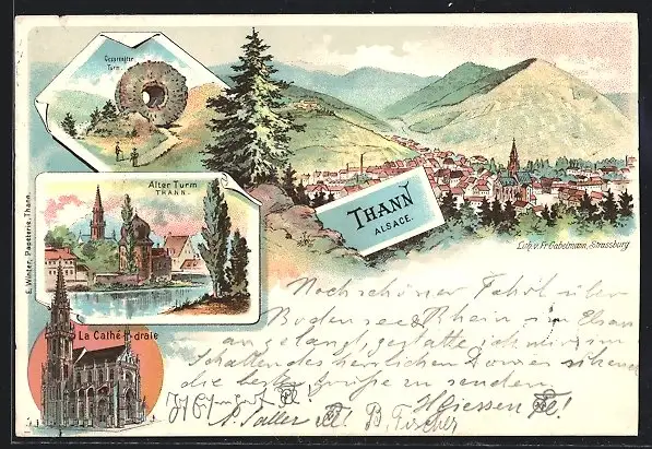 Lithographie Thann, Gesprengter Turm, Gesamtansicht, Alter Turm, Cathedrale