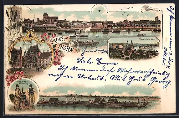 Lithographie Thorn, Artushof, Eisenbahnbrücke, Flösserei