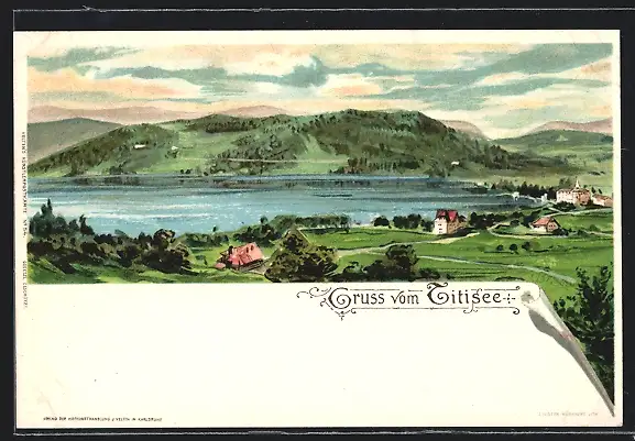 Lithographie Titisee, Totalansicht aus der Vogelschau