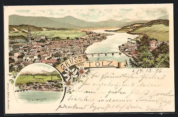 Lithographie Tölz, Teilansicht mit Kirche, Krankenheil