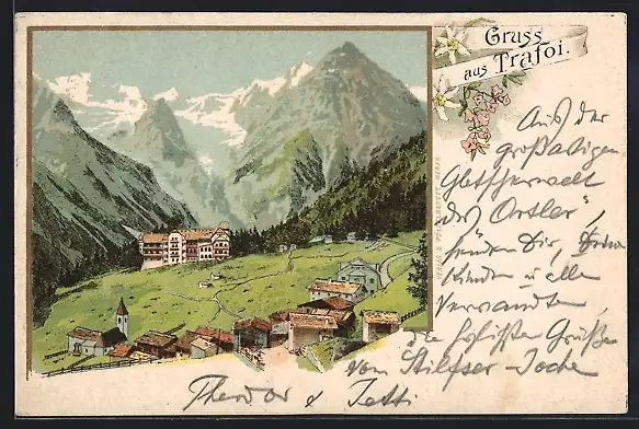 Lithographie Trafoi, Teilansicht mit Gebirge