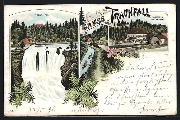 Lithographie Traunfall, Partie mit dem Gasthaus am Traunfall, Kanal & Wasserfall