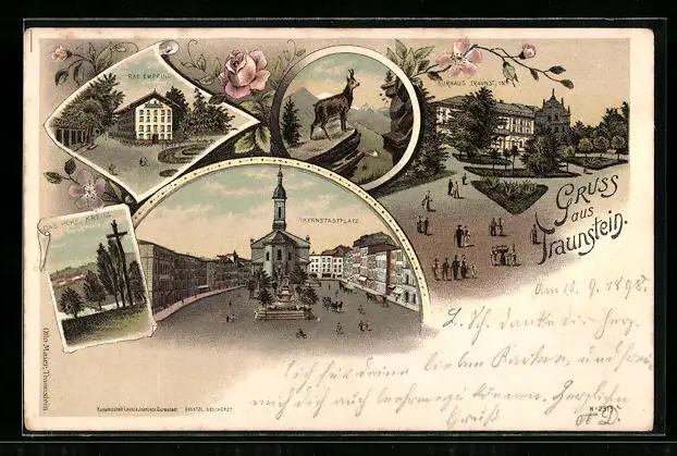 Lithographie Traunstein, Kurhaus Traunstein, Bad Empfing, Obernstadtplatz