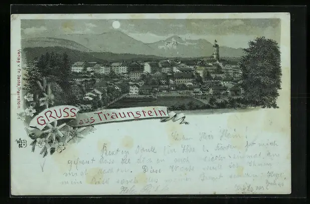 Lithographie Traunstein, Totalansicht aus der Vogelschau