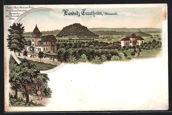 Lithographie Trautheim i. Odenwald, Ortsansicht mit Kirche, Spaziergänger im Park