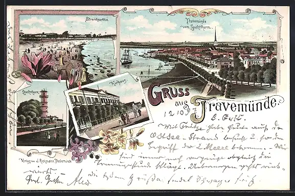 Lithographie Travemünde, Kurhaus, Leuchtturm, Strandpartie