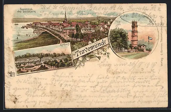 Lithographie Travemünde, Leuchtturm, Kurhaus