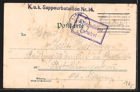 Personenbezogene Daten auf der Rückseite der Karte wurden durch blauen Textmarker unkenntlich gemacht. Die blauen Stellen sind auf die Vorderseite durchgeweicht und wirken sich negativ auf das Postkartenfoto aus