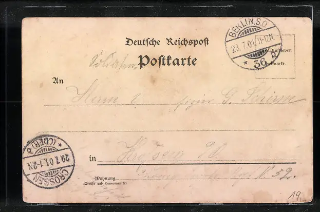 Personenbezogene Daten auf der Rückseite der Karte wurden durch blauen Textmarker unkenntlich gemacht. Die blauen Stellen sind auf die Vorderseite durchgeweicht und wirken sich negativ auf das Postkartenfoto aus