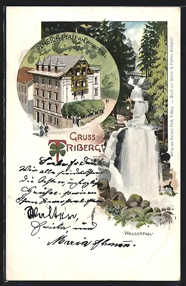 Lithographie Triberg, Pension Pfaff am Wasserfall