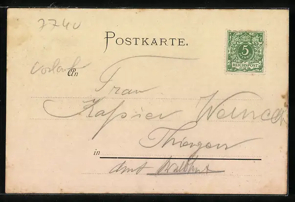 Personenbezogene Daten auf der Rückseite der Karte wurden durch blauen Textmarker unkenntlich gemacht. Die blauen Stellen sind auf die Vorderseite durchgeweicht und wirken sich negativ auf das Postkartenfoto aus