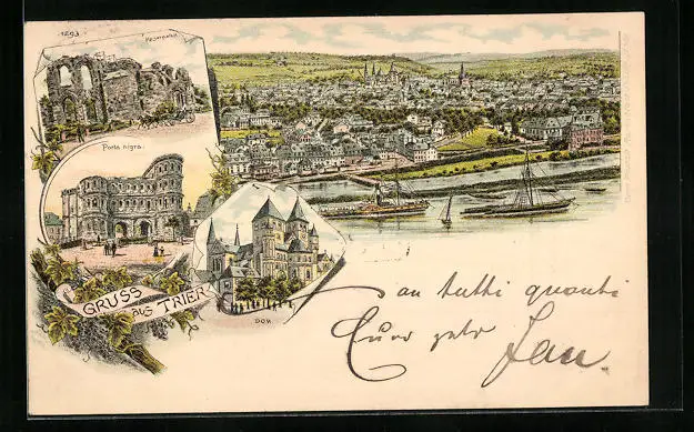 Lithographie Trier, Dom, Porta Nigra, Panorama der Stadt