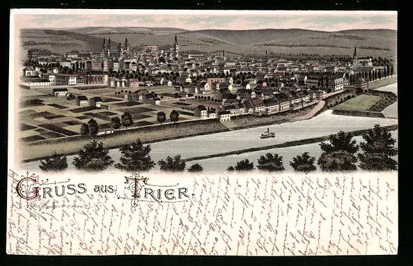 Lithographie Trier, Generalansicht der Stadt mit der Mosel im Vordergrund