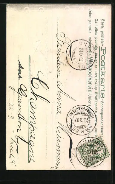 Personenbezogene Daten auf der Rückseite der Karte wurden durch blauen Textmarker unkenntlich gemacht. Die blauen Stellen sind auf die Vorderseite durchgeweicht und wirken sich negativ auf das Postkartenfoto aus