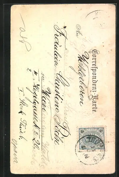 Personenbezogene Daten auf der Rückseite der Karte wurden durch blauen Textmarker unkenntlich gemacht. Die blauen Stellen sind auf die Vorderseite durchgeweicht und wirken sich negativ auf das Postkartenfoto aus