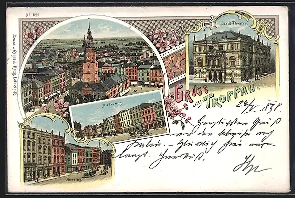 Lithographie Troppau, Niederring, Oberring und Stadttheater