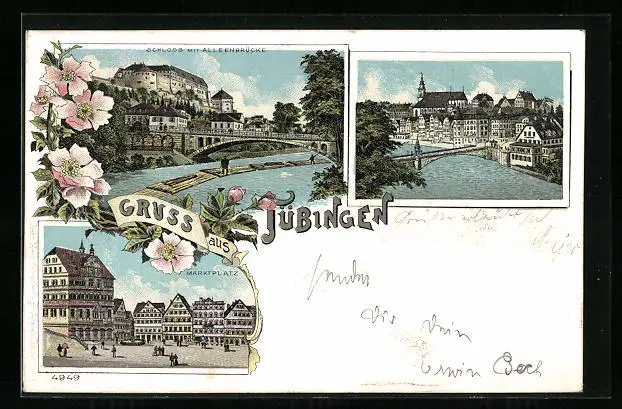 Lithographie Tübingen, Ortsansicht, Schloss mit Alleenbrücke, Marktplatz