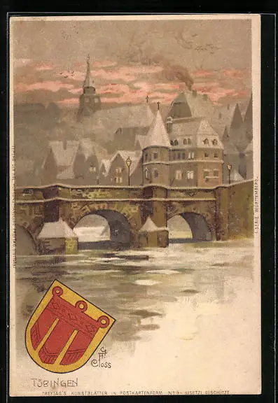 Lithographie Tübingen, Ortsansicht im winterlichen Morgenrot, Wappen