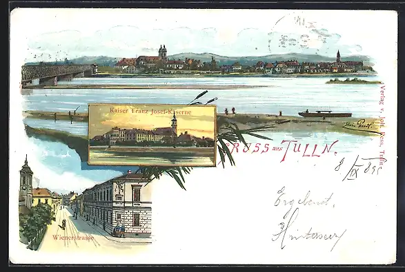 Lithographie Tulln, Wienerstrasse, Kaiser Franz Josef-Kaserne, Ortsansicht