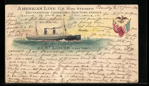 Lithographie US Mail Steamer St. Louis, Fahnen, Vogel