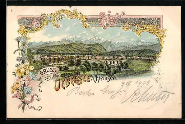 Lithographie Übersee a. Chiemsee, Teilansicht