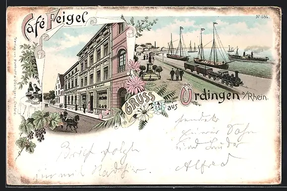 Lithographie Uerdingen, Cafe Feigel, Partie am Rheinhafen