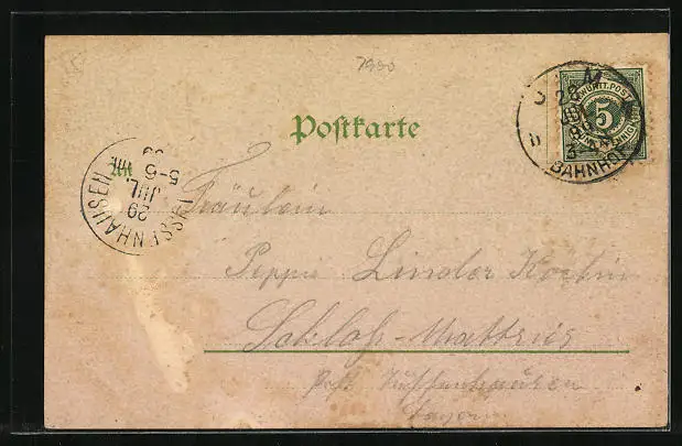 Personenbezogene Daten auf der Rückseite der Karte wurden durch blauen Textmarker unkenntlich gemacht. Die blauen Stellen sind auf die Vorderseite durchgeweicht und wirken sich negativ auf das Postkartenfoto aus