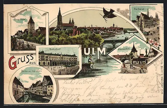 Lithographie Ulm / Donau, Bahnhof, Mezgerthrum, Rathaus, Zundelthor