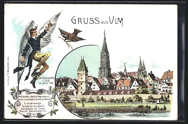 Lithographie Ulm / Donau, Der Schneider, Ortsansicht