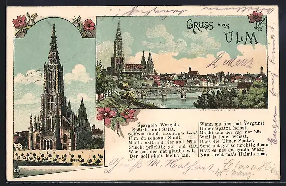 Lithographie Ulm / Donau, Münster, Donaubrücke vom Ufer aus