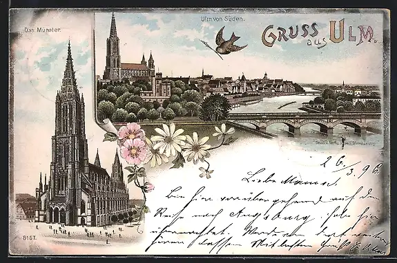 Lithographie Ulm / Donau, Münster, Ortsansicht von Süden gesehen