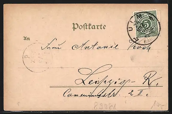 Personenbezogene Daten auf der Rückseite der Karte wurden durch blauen Textmarker unkenntlich gemacht. Die blauen Stellen sind auf die Vorderseite durchgeweicht und wirken sich negativ auf das Postkartenfoto aus
