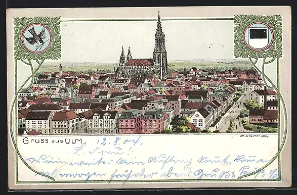 Lithographie Ulm / Donau, Teilansicht mit Münster, Stadtwappen